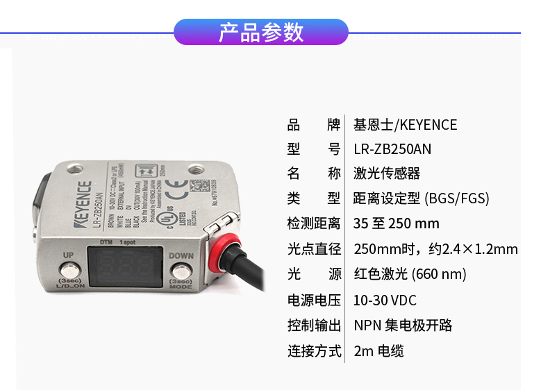 日本KEYENCE基恩士光電傳感器LR-ZB250AN 放大器內置型CMOS激光傳感器 LR-Z系列: 同級別中的檢測能力 堅固&長壽命,對油、酸和堿性清潔劑高度耐受,可在惡劣環境下使用 簡化操作 應用廣泛